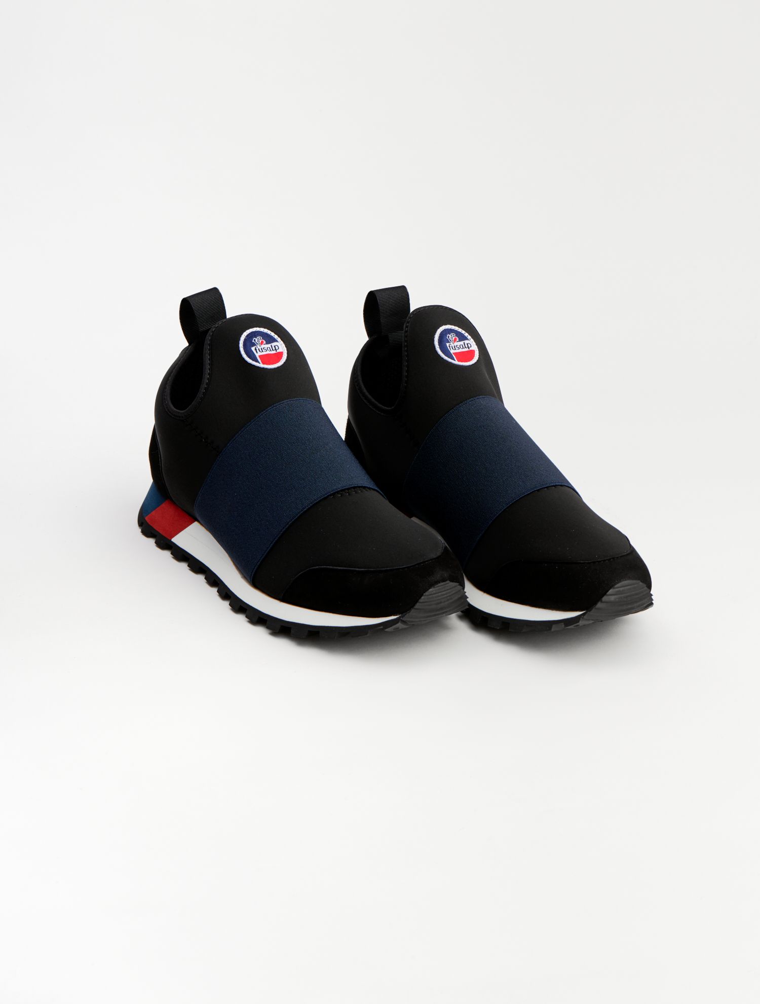 Baskets bicolores confectionnées en matière aspect néoprène et bande élastique.